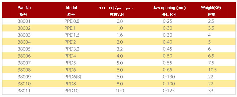 .額定載荷是指吊鉗成對使用、吊點夾具為60度時允許起吊的最大重量,吊裝作業中兩只或4只配套成組使用